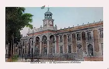 - Aragón, Carlos (19 de agosto de 1872). «Remitidos». Boletín Oficial (Tomo 1 Número 72) (Santa Ana). p. 2. Consultado el 2 de junio de 2019. «El único edificio público que pertenece á la Municipalidad es el Cabildo, este fue incendiado el 2 de [...]iembre de 1870 i aunque el 11 de Marzo del corriente se celebró la contrata para su construccion por [...] Gobernador del Departamento [...], mí como alcalde, con empresarios competentes, no se ha podido llevar á cabo, porque el Gobierno [...]biera dar el el dinero para este [...] no ha podido por haber es[...]irtiendo todo el tesoro na[...] atenciones mas perentorias [...]».
