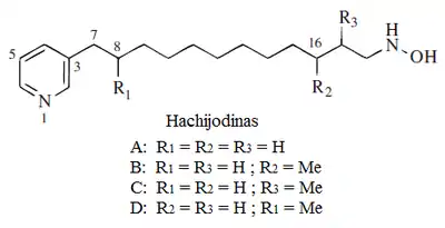 - Hachijodines A-G: Seven New Cytotoxic 3-Alkylpyridine Alkaloids from Two Marine Sponges of the Genera Xestospongia and Amphimedon. Sachiko Tsukamoto, Motohiko Takahashi, Shigeki Matsunaga, Nobuhiro Fusetani, Rob W. M. van Soest J. Nat. Prod. (2000) v.63:pp. 682-684