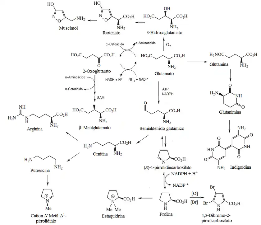 - b) Pseudoalcaloides: Metabolitos secundarios que poseen un nitrógeno, pero que no han sido biosintetizados a partir de aminoácidos, sino que se forman por transferencia de nitrógeno en forma de amoniaco a un compuesto de origen terpénico, esteroide, policétido, monosacárido o a un ácido graso.