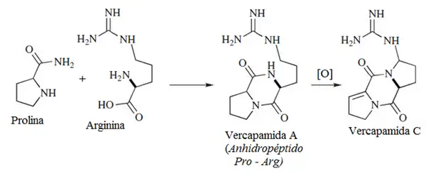 - c) Protoalcaloides: Metabolitos secundarios que no forman un sistema heterocíclico y se forman a partir de un aminoácido proteínico. Muchos de estos compuestos contienen un grupo amino, amida, etc.[3]