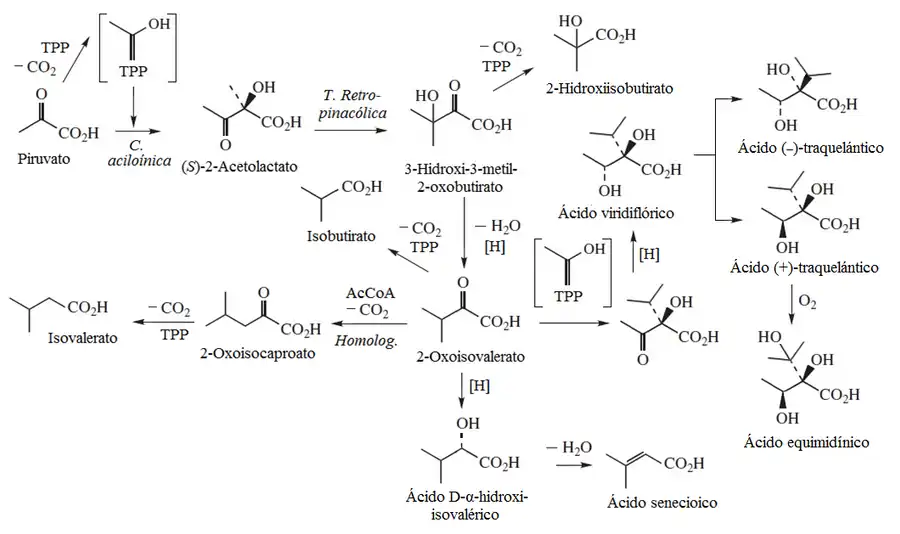 - - Segunda condensación aciloínica del piruvato con descarboxilación en presencia de TPP. El producto formado es el intermediario ácido (2R)-2-acetil-2-hidroxi-3-metilbutanoico. Su descarboxilación en presencia de coenzima A y TPP produce el ácido viridiflórico. Éste compuesto es precursor de los ácidos traquelánticos, el ácido equimidínico y el ácido lasiocárpico.