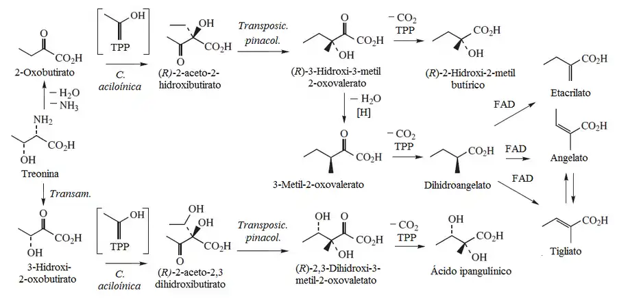 - - Sufrir deshidratación e hidrogenación para producir el ácido 3-metil-2-oxovalérico. Este ácido puede formar isoleucina por transaminación. Este mismo ácido puede descarboxilarse en presencia de TPP y coenzima A para formar el ácido dihidroxiangélico. La deshidrogenación con FAD puede producir los isómeros ácido tíglico, ácido angélico y ácido etacrílico.