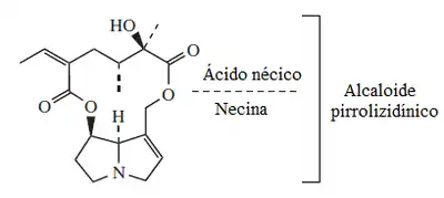Los alcaloides pirrolizidínicos constan de 2 componentes estructurales: la necina, que es la pirrolizidina como tal, y el ácido nécico, el cual es un derivado de los aminoácidos ramificados valina, treonina, leucina o isoleucina.