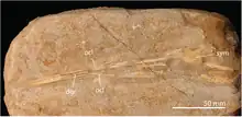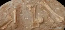 ![]() A, húmero del holotipo; B, radio y ulna del holotipo; C, esternón del holotipo; D, IV metacarpo referido; E, IV metacarpo y escapulocoracoides del holotipo; F, fémur del holotipo. | ||
