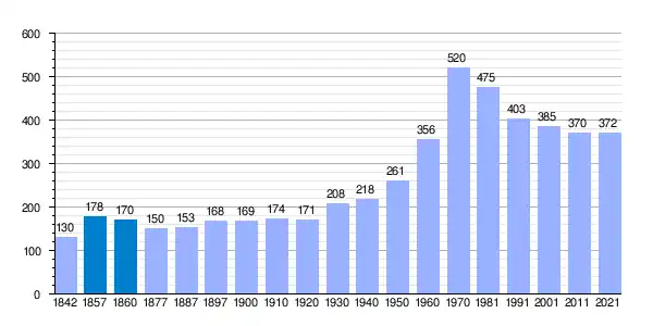 | Gráfica de evolución demográfica de Aldehuela del Jerte[6] entre 1842 y 2021 |