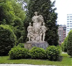 La pieza escultórica es una obra diseñada por el escultor Manuel Álvarez Laviada, hecha por encargo del Ministerio de Fomento y tallada en piedra, que fue erigida en origen en la parte superior del antiguo edificio de la seguridad social que se encontraba en la céntrica plaza del Carmen, si bien tras su demolición en 2007 la pieza escultórica cambió su ubicación a la actual.[3] La obra está compuesta por una mujer, dos adolescentes y un niño y con ella el autor quiso representar los distintos estamentos sociales que el entonces Instituto Nacional de Previsión amparaba: el trabajo, la maternidad y la infancia.