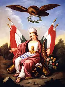 La Alegoría de la Patria Mexicana tiene su origen a principios de la guerra de independencia mexicana cuando un grabado impreso en un Préstamo patriótico a principios de 1808 en favor del Rey N. S. D. Fernando Séptimo y sus vasallos españoles representa a la vieja España y a la Nueva España como dos figuras soberanas, como dos países distintos que están al mismo nivel; dos mujeres unidas en la defensa de la corona de Fernando VII. Así, desde antes de que Miguel Hidalgo iniciara la lucha por la independencia en 1810, la imagen de la Patria soberana parece ser ya una realidad tangible; ya se puede ver.