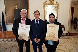 ![]() Alejandro Rejón recibiendo el título como Huésped Distinguido de Salamanca, España en manos del alcalde Carlos García Carbayo | ||