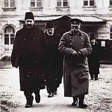 Guchkov, en el centro, entre el primer ministro del Gobierno provisional ruso, Gueorgui Lvov y el jefe del Estado Mayor ruso, general Mijaíl Alekséyev en Maguilov en la primavera de 1917.