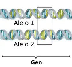 Un alelo o alelomorfo[1][2] (del griego ἁλλήλως, lit. «de uno para con el otro») es cada una de las formas alternativas que puede tener un mismo gen[3] y que se puede manifestar en modificaciones concretas de la función de éste (producen variaciones en características heredadas como, por ejemplo, el color de ojos o el grupo sanguíneo).[4] Dado que la mayoría de los mamíferos son diploides, poseen dos juegos de cromosomas, uno de ellos procedente del padre y el otro de la madre. Cada par de alelos se ubica en igual locus o lugar del cromosoma.[3]
