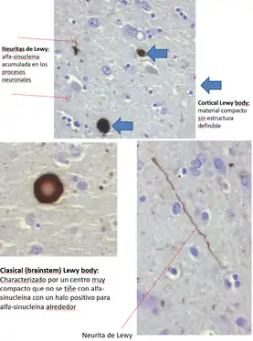 Debido a que los cuerpos de Lewy en neuronas corticales no están rodeados por un halo preciso, como en la sustancia negra en casos de enfermedad de Parkinson, no se apreciaron con facilidad hasta que se desarrollaron estas tinciones de anticuerpo. De manera indudable, el hecho de que el principal componente del cuerpo de Lewy es α-sinucleína agrupada, ha de resultar importante para comprender tanto la enfermedad de Parkinson como la demencia de cuerpo de Lewy.
