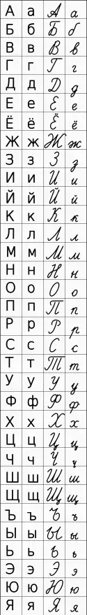 En las escuelas de Rusia se enseña a los alumnos a escribir en este sistema y a diferenciar entre el alfabeto cursivo y el alfabeto impreso, ya que algunas letras difieren entre la pronunciación y la gramática