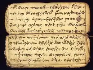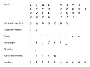 Como en la mayoría de las otras escrituras brahmicas, la vocal corta /-a/ no está escrita; otras vocales se escriben con signos diacríticos antes (/-i, -o/), después (/-ā, -u/) o debajo (/-e/) de la consonante inicial. Sin embargo, la marca de longitud se escribe sobre la inicial, así como sobre cualquier consonante diacrítica final, y se fusiona con /-o/ y /-u/; cuando se fusiona como /-ō/, sin embargo, se encuentra debajo de cualquier consonante final. Las vocales iniciales no tienen letras separadas, pero se escriben con los diacríticos de las vocales sobre una letra de consonante cero con forma de &.