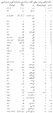 | Letras | ا ب ﭖ ت ټ ث ج ﭺ ځ څ ح خ د ډ ذ ر ړ ز ﮊ ږ س ش ښ ص ض ط ظ ع غ ف ق ک ګ ل م ن ڼ و ه ی ي ې ۍ ٸ | |