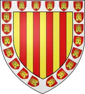 Su escudo heráldico se representa con los palos del Señal de Aragón y veinte escudetes del escudo de Castilla en una bordura, siguiendo la costumbre castellana de representar las armas de la familia materna.[4]