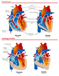 El síndrome del bebé azul, conocido como Tetralogía de Fallot, consiste en una pared incompleta entre los ventrículos (conocido como defecto ventricular septal), una aorta que se encuentra en este defecto, para que su sangre proviene de ambos ventrículos en lugar de desde la izquierda (superposición de la aorta), un defecto del tracto de salida ventricular derecho, cerca de la válvula pulmonar que impide que el flujo total de sangre a los pulmones, y un ventrículo derecho muscular necesarios para realizar el trabajo extra que se requiere para superar ese defecto (hipertrofia del ventrículo derecho).[cita requerida]