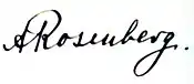 Rosenberg fue condenado a muerte el 1 de octubre de 1946[19] por conspiración para librar una guerra de agresión, librar una guerra de agresión o crímenes contra la paz, crímenes de guerra y crímenes contra la humanidad,[20] y ejecutado en la horca el 16 de octubre de 1946.[21] Según Joseph Kingsbury Smith, que cubrió las ejecuciones para el Servicio Internacional de Noticias, Rosenberg fue el único condenado que, cuando se le preguntó en la horca si tenía alguna última declaración que formular, respondió con una sola palabra: "No".[cita requerida]