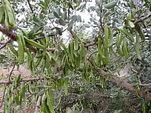 El fruto es una vaina coriácea de color castaño oscuro, de 5 a 8 cm de longitud, que en el algarrobo blanco contiene una pulpa gomosa. Esta vaina contiene las semillas, parecidas a una lenteja grande.