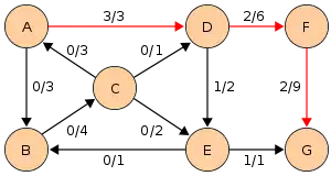 En los pares escritos en los lados , es el flujo actual, y es la capacidad. La capacidad de la resta entre y es , la capacidad total, menos el flujo que está en uso. Si el flujo desde a es negativo, esto contribuye a la capacidad del residuo.