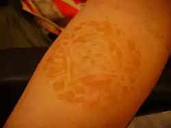 Originalmente se utilizaba solo en las palmas de las manos de las mujeres.[cita requerida] Con el paso del tiempo, fue igual de común el uso entre los hombres.[cita requerida] Uno de los diseños más tradicionales de la India es la representación del sol en la palma de la mano.[cita requerida]