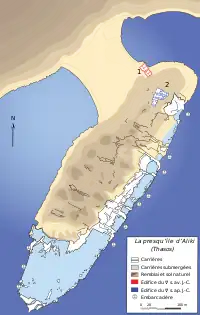 El promontorio de Aliki es un espolón de mármol, probablemente explotado desde el comienzo de la ocupación de la isla, en el siglo VII a. C. La explotación del mármol ha sido tan intensiva y prolongada en el tiempo que toda la extremidad sur de la península está enrasada al nivel del mar, mientras que los flancos occidentales y surorientales de la colina están muy mermados. A medida que ha crecido la explotación, los frentes de las canteras han progresado hacia el norte y el este, mientras que los desmontes eran rechazados hacia la cumbre.