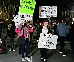 El alcance de los impactos ambientales depende de los métodos de producción de alimentos y los tipos de alimentos producidos.[11] La Unión de Científicos Preocupados aconseja que evitar comer carne de vacuno puede potencialmente ayudar al medio ambiente,[12] debido a las grandes cantidades de agua necesarias para producir carne de res, la contaminación de las heces, el amoníaco, el dióxido de carbono y los desechos de metano asociados con la cría de vacas, los daños causados por el pastoreo y la destrucción del hábitat de la vida silvestre y las selvas tropicales para producir tierras de pastoreo.[12] La carne producida industrialmente, como la de animales criados en operaciones de alimentación de animales confinados o CAFO, tiene "el mayor impacto de cualquier producto alimenticio en el medio ambiente".[13]