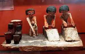 Los alimentos básicos eran el pan (véase: Historia del pan) y la cerveza (heneket) elaborada con cebada. Se ha descubierto una veintena de tipos de pan, de diferentes formas y composiciones.