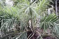 Esta es una palmera acaule, pequeña, con tronco subterráneo, frecuentemente ramificado, lo que da lugar a un conjunto de coronas de plumosas hojas, las que tienen tonos gris-verdosos oscuros por encima y gris-plateado por debajo, y miden aproximadamente 150 cm de largo. En condiciones húmedas y semisombreadas puede crecer formando un tronco de un metro o más de altura. Los frutos poseen 20 mm de diámetro, tienen forma triangular y son amarillos al madurar. Se presenta a menudo formando rodales muy densos.