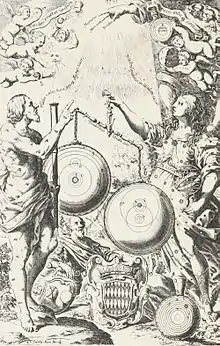 En este sentido, la portada del libro es una elaborada alegoría de su propósito: el grabado muestra a Astrea (la diosa de la justicia) en presencia de Argos Panoptes (el gigante de los cien ojos) comparando con una balanza la teoría heliocéntrica (en el disco de la izquierda) con la teoría geocéntrica (en el lado derecho), que sale vencedora de la comparación. Tumbado, en la parte inferior del dibujo, aparece el astrónomo Claudio Ptolomeo.[2]