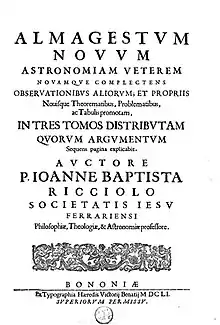 | Título original | Almagestum novum : astronomiam veterem novamque complectens observationibus aliorum, et propriis nouisque theorematibus, problematibus ac tabulis promotam, in tres tomos distributam quorum argumentum sequens pagina explicabit | |