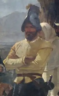 ![]() Alonso de Monroy en el óleo «La fundación de Santiago» de Pedro Lira (1858) | ||