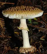 El píleo (sombrero) de A. australis tiene formato inicialmente convexo, pero con el pasar del tiempo tiende a quedar plano o desarrolla una depresión central. Llega a 20–90 mm de diámetro.[10] A veces, el margen del píleo está agrietado y se enrolla hacia atrás, dándole un aspecto rugoso. El centro del píleo es de color cuero oscuro, color miel o amarillo-blanquecino, con un tono más pálido cerca del margen. La superficie es pegajosa cuando la seta es joven o está mojado, pero cuando el hongo madura queda seco. Los restos de la volva forman verrugas cónicas a piramidales que están densamente agrupadas en el centro, llegando a ser escasas y más bajas hacia el margen. Inicialmente son blancas y luego sepia-grisáceas o amarillo-blanquecino, con puntas blancas o color piel.[1]