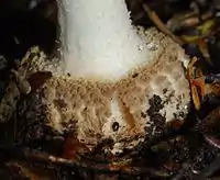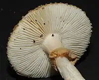 Las laminillas están atestadas, son blancas, están libres de adhesión al tronco y miden 6-10 mm de ancho. Las lamélulas (láminas cortas que no se extienden completamente desde el borde del píleo para el tronco) tienen extremidades truncadas. El estipe (tallo) mide 3,7 a 9,0 cm de altura y 0,6 a 2,6 cm de diámetro, siendo más cónico en el centro. Es hueco y tiene una base abruptamente bulbosa con un espesor entre 1,4 y 3,8 cm. La superficie del estipe por encima del nivel del anillo es blanca y está cubierta por mechones algodonosos de micelio; ya por debajo del anillo es blanco con surcos transversales castaños y grisáceos. La base puede o no puede tener un aro quebradizo de restos de la volva de color castaño amarillento a gris-sepia. El anillo es transparente, blanco a castaño amarillento, inicialmente colgado libremente y después adherido al tallo. La carne del píleo es blanca, ocasionalmente amarillo blanquecino pálido sobre el centro del píleo; ya la carne del tronco es toda blanca.[1]