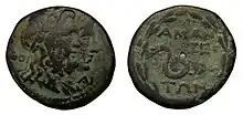 Moneda de bronce con la leyenda ΑΜΑΝΤΩΝ (AMANTON) con una serpiente en el reverso y las cabezas de Zeus y Dione en el anverso.