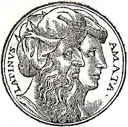 Así, cuando vino Eneas, que era troyano y por tanto forastero, Latino creyó conveniente que este se casase con su hija, pero Amata no. Por esto, la reina, con una ira que la transmitieron Juno y Alecto, intentó impedir la alianza entre Lavinia y Eneas.[2] Al ver que era imposible la victoria de Turno en contra de los troyanos, y viendo que no podía impedir la boda entre Eneas y Lavinia, se ahorcó, ante la horrorizada mirada de su hija.[3]