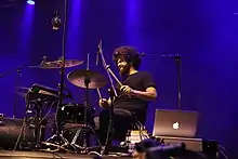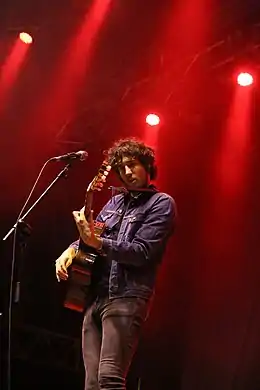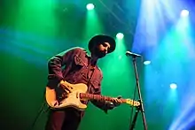 ![]() Joni Antequera en un concierto de Amatria durante el festival Palencia Sonora 2017. | ||