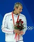 Amaury Leveaux tras ganar la medalla de plata en los 50 m durante los Juegos Olímpicos de Pekín 2008.
