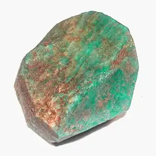 La amazonita es la escasa variedad verde de la microclina, un mineral del grupo de los feldespatos (potásicos). Durante muchos años se pensó que su color se debía al cobre ya que los compuestos de este metal suelen ser verdes o azules. Sin embargo estudios más recientes sugieren que su color verde-azulado se debe a pequeñas cantidades de plomo y agua que contiene.