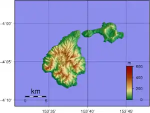 Mapa topográfico de Islas Feni. Ambitle es la isla más grande a la izquierda.