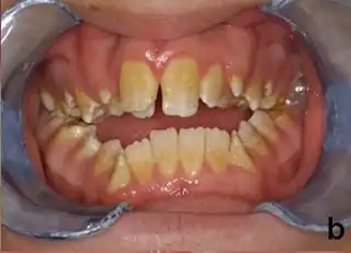 ![]() Amelogénesis imperfecta, tipo hipoplásico. Nótese la asociación de esmalte picado y mordida abierta. | ||