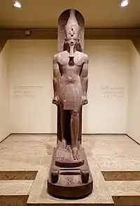 El faraón porta la Doble Corona del Alto y el Bajo Egipto, una gruesa barba trenzada postiza, sandalias, collar ancho, brazaletes, pulseras y un faldellín ceremonial particularmente sofisticado, plisado y con un delantal rematado por cobras solares; su rostro es casi infantil, aunque el cuerpo atlético es el de un hombre en la flor de la vida. Algunas partes no pulidas permaneciendo con su textura rugosa natural (el collar, los brazaletes y pulseras) probablemente estaban originalmente chapadas en oro. La pose rígida, con los brazos a lo largo del cuerpo y los puños cerrados y el pie izquierdo avanzado, es la convencional, pero la presencia de un trineo no tiene parangón en la iconografía escultural: el pilar dorsal y el basamento entre los pies y el trineo indican que no es una figura del soberano, sino de una estatua suya: se trataría por lo tanto de la reproducción de una estatua siendo transportada (verosímilmente en una procesión) sobre un trineo.