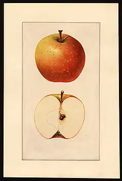 ![]() La variedad de manzana 'American Summer Pearmain' sinónimo 'Summer Pearmain' con secciones cruzadas. | ||