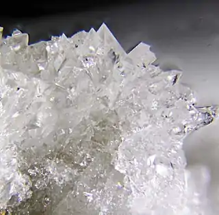 Aparece como pequeños cristales incoloros, formados por los prismas rómbicos {110} y {001}, combinados de tal forma que el cristal aparenta ser una dipirámide.[2] Es un mineral muy raro, conocido solamente en cuatro localidades en el mundo, la localidad tipo, las minas Vostochnyi y Kirovskii en el macizo de Chibiny, región de Murmansk (Rusia), de donde proceden los mayores cristales conocidos,[3] y también la cantera de Las Urracas, en el volcán El Arzollar, Campo de Calatrava (Ciudad Real).[4] Además de estar poco difundido, es muy escaso en las cuatro localidades citadas.