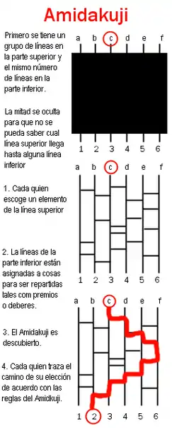 Amidakuji o Amida (阿弥陀籤?) es un juego japonés de lotería diseñado para crear relaciones de pares al azar entre dos conjuntos de cualquier tamaño, siempre y cuando éstos contengan el mismo número de elementos. Comúnmente se usa para repartir cosas al azar entre personas, donde el número de cosas a distribuir es el mismo que el número de personas. Por ejemplo, premios o tareas pueden asignarse de una manera justa y al azar con este método.
