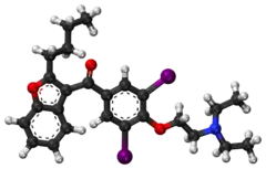 - Charlier R, Deltour G, Tondeur R, Binon F (1962). «[Studies in the benzofuran series. VII. Preliminary pharmacological study of 2-butyl-3-(3,5-diiodo-4-beta-N-diethylaminoethoxybenzoyl)-benzofuran.]». Archives internationales de pharmacodynamie et de thérapie (en francés) 139: 255-64. PMID 14020244.