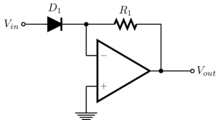 Para lograr la operación inversa, se intercambian las posiciones del diodo y de la resistencia, para dar lugar a la tensión de salida: