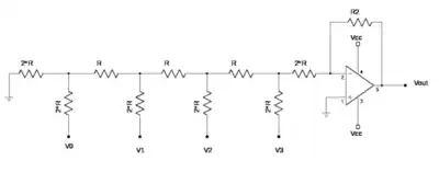 Mediante una red de resistencias R-2R, se pueden introducir en los extremos señalados como , , y señales digitales del valor adecuado para realizar la conversión. En este caso, desde cualquiera de las entradas, con las demás conectadas a tierra, la resistencia de entrada es del valor: