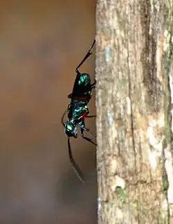 Se destaca la especie Ampulex compressa, también llamada avispa esmeralda, por su comportamiento con las presas. Inyecta un veneno generalizado que debilita a la cucaracha y después inyecta un segundo veneno cuidadosamente en el cerebro de su víctima con el cual la cucaracha queda paralizada pero capaz de movimientos automáticos. Luego procede a cortar la mayor parte de las antenas. Tomando los muñones con sus mandíbulas va guiando a la cucaracha la cual la sigue caminando hasta su cueva. Allí, deposita un huevo. La larva se alimenta de la cucaracha paralizada pero viva. Emerge como adulto.