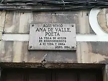 En 1980, el Ayuntamiento de Avilés creó el certamen de Poesía Ana de Valle, cuya última edición data de 2010.[5] Desde abril de 1984, una placa conmemorativa en la fachada del edificio recuerda que de Valle vivió en una casa ubicada en el número 9 de la plaza de Álvarez Acebal, último domicilio de la poeta en la ciudad, donde también estuvo ubicado el taller de encuadernación.[6]