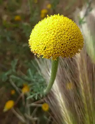 Mata tomentosa, ramificada desde la base, de hasta unos 30 centímetros de altura. Raíz pivotante. Hojas alternas, bipinnado-partidas, algo carnosas, de color verde o verde rojizo. Capítulos solitarios de unos 2 cm de diámetro, sin lígulas, de estrechos pedúnculos. Brácteas involucrales lanceoladas de borde escarioso y receptáculo con brácteas interseminales. Flores flosculosas, con alas laterales. Aquenio de pequeñas alas.